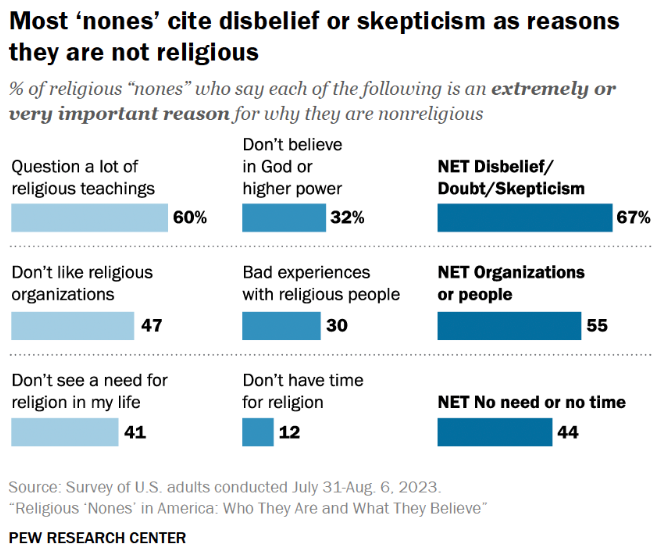 Newly released 2023 data from the Pew Research Center’s National Public Opinion Reference Surveys found that 28% of US adults are religiously unaffiliated “nones”, unseating the former majority held by Evangelicals (now 24% of the overall population). When I was growing up in the 1980s, this "nones" group was only at about 5-6%. Most of these nones are not atheists – far from it. Most classify themselves as generally ‘spiritual’ or agnostic. They have the sense of a higher power and are even curious about the potential of a supernatural being or beings.